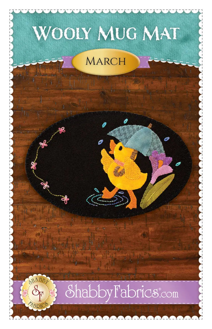 Wooly Mug Mat March: Designed with the beginner in mind, the Wooly Mug Mat Series combines beautiful embroidery and colorful applique for a simple project that you can look forward to displaying each month. March's design features a duckling splashing around on a rainy day with raindrops and flower details. Finished mug mat measures 9½" x 6".