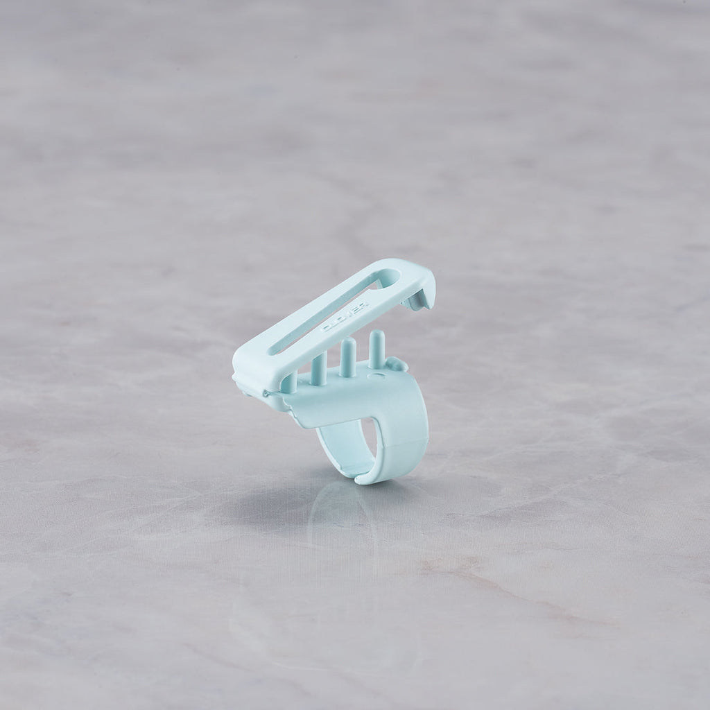 - Insert index finger to Yarn Guide, flip top open placing yarns between guides to snap close over yarn