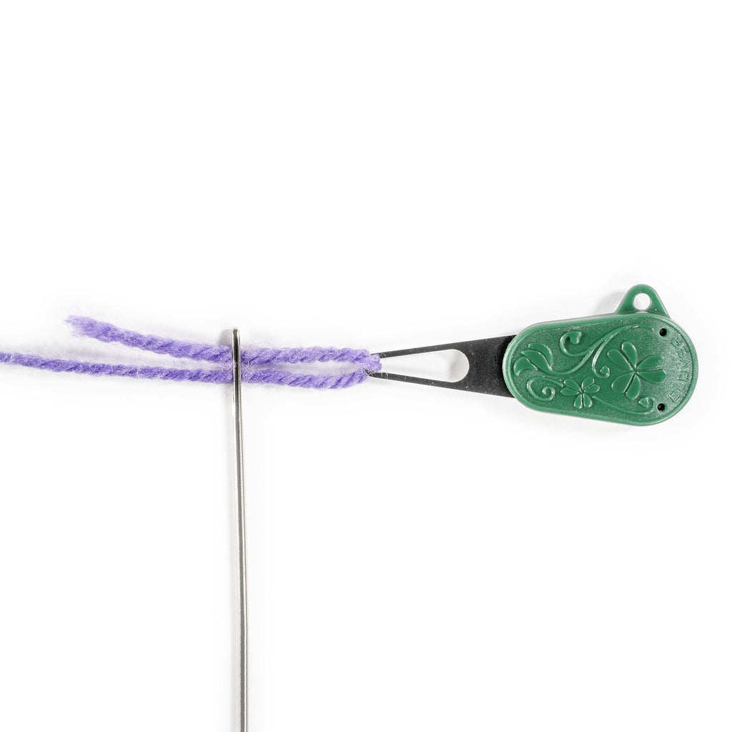 A firm flat threader with a large opening, this product is ideal for hard-to-thread yarns (long fiber yarns, etc.)